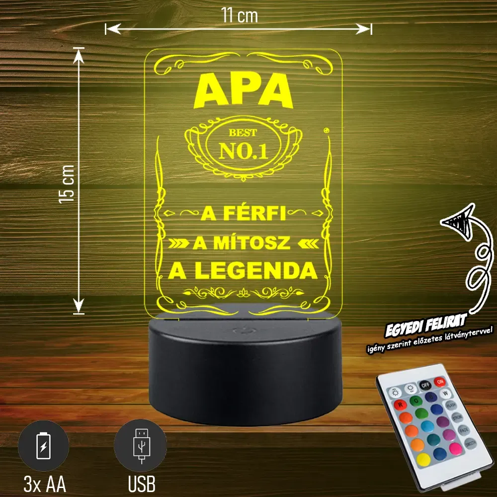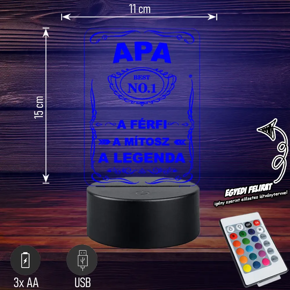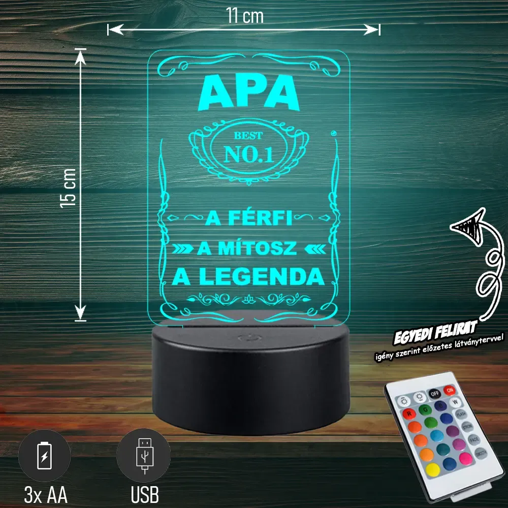 💡 Egyedi 3D LED lámpa „👑 Apa – A férfi, a mítosz, a legenda” felirattal. 🎁 Tökéletes ajándék minden apának! Bővebben| Cikkszám | GM3DAA04 |