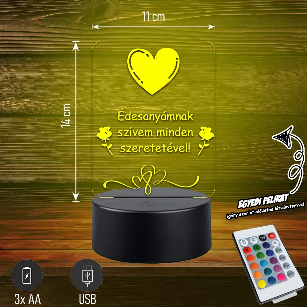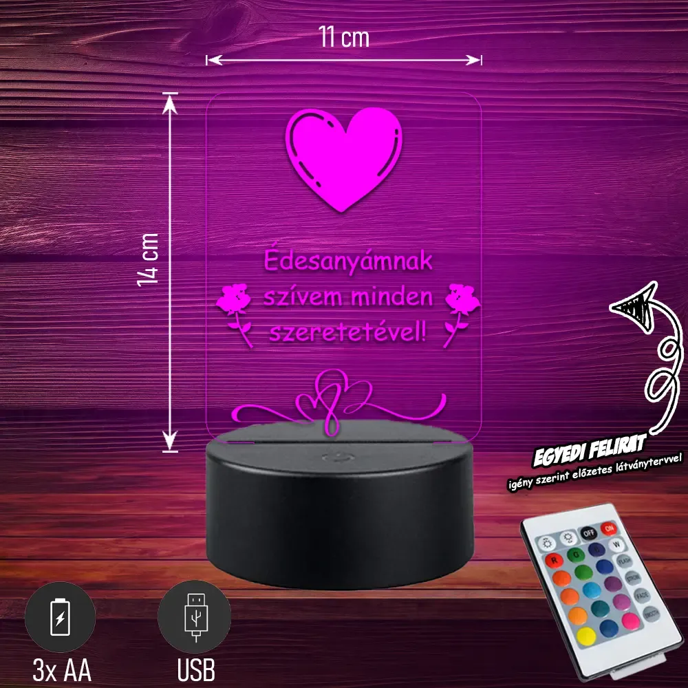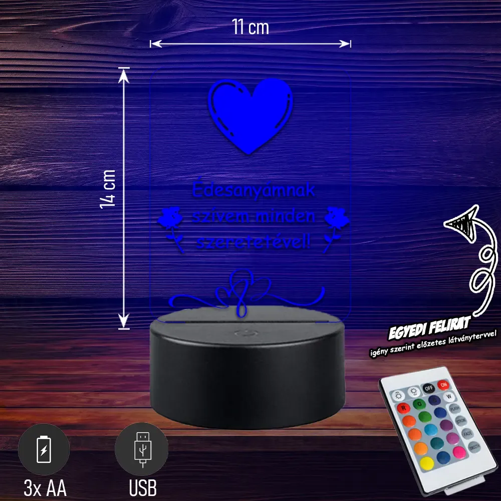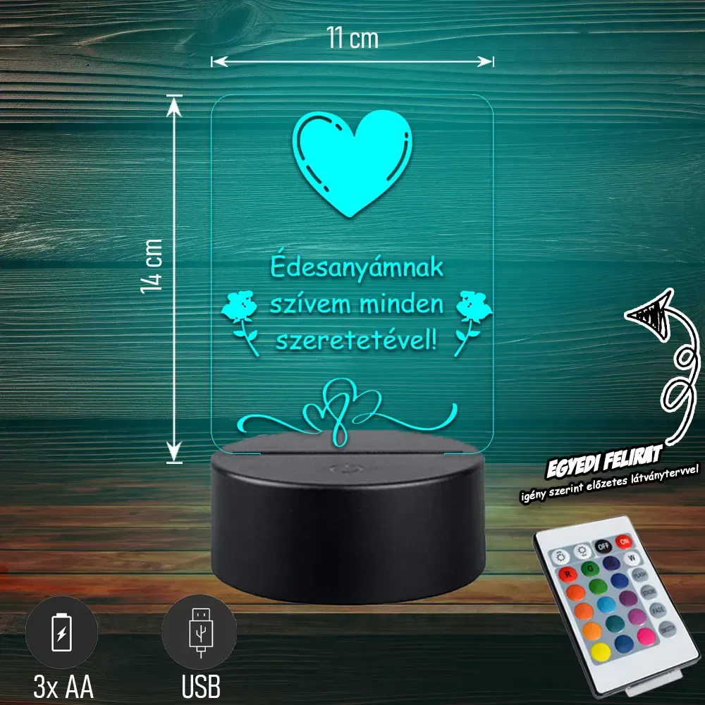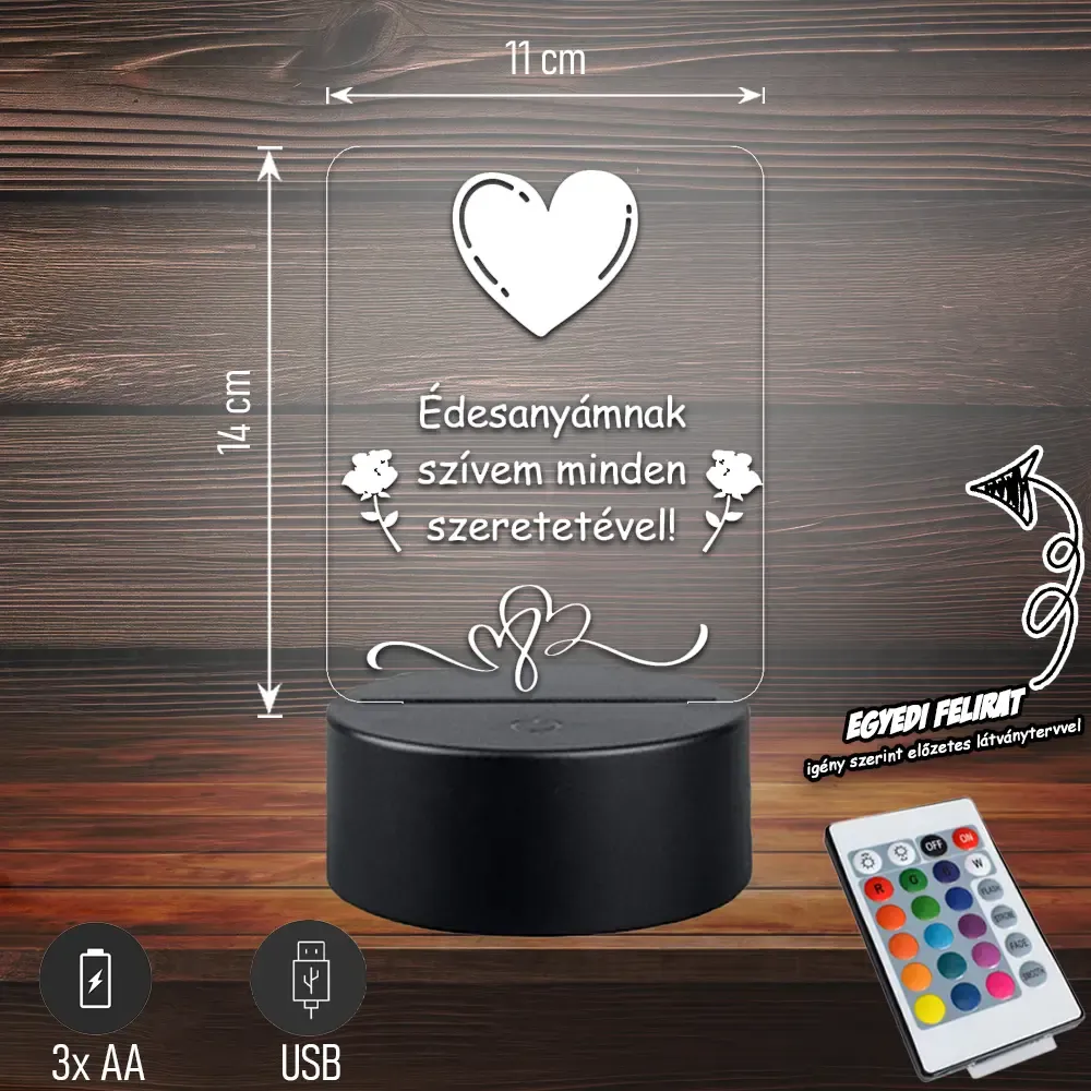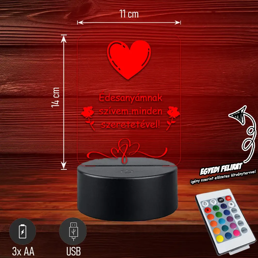 💖💡 Édesanyámnak szívem minden szeretetével | 3D LED Lámpa Egy különleges, szív alakú lámpa megható felirattal, amely minden nap kifejezi az édesanya iránt érzett szeretetet. Tökéletes, szívből jövő ajándék anyák napjára vagy bármilyen alkalomra. 🎁✨ Bővebben| Cikkszám | GM3DAAN07 |
