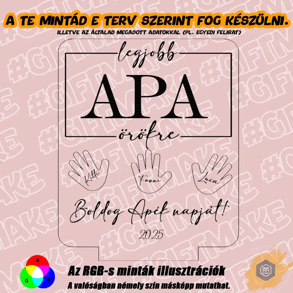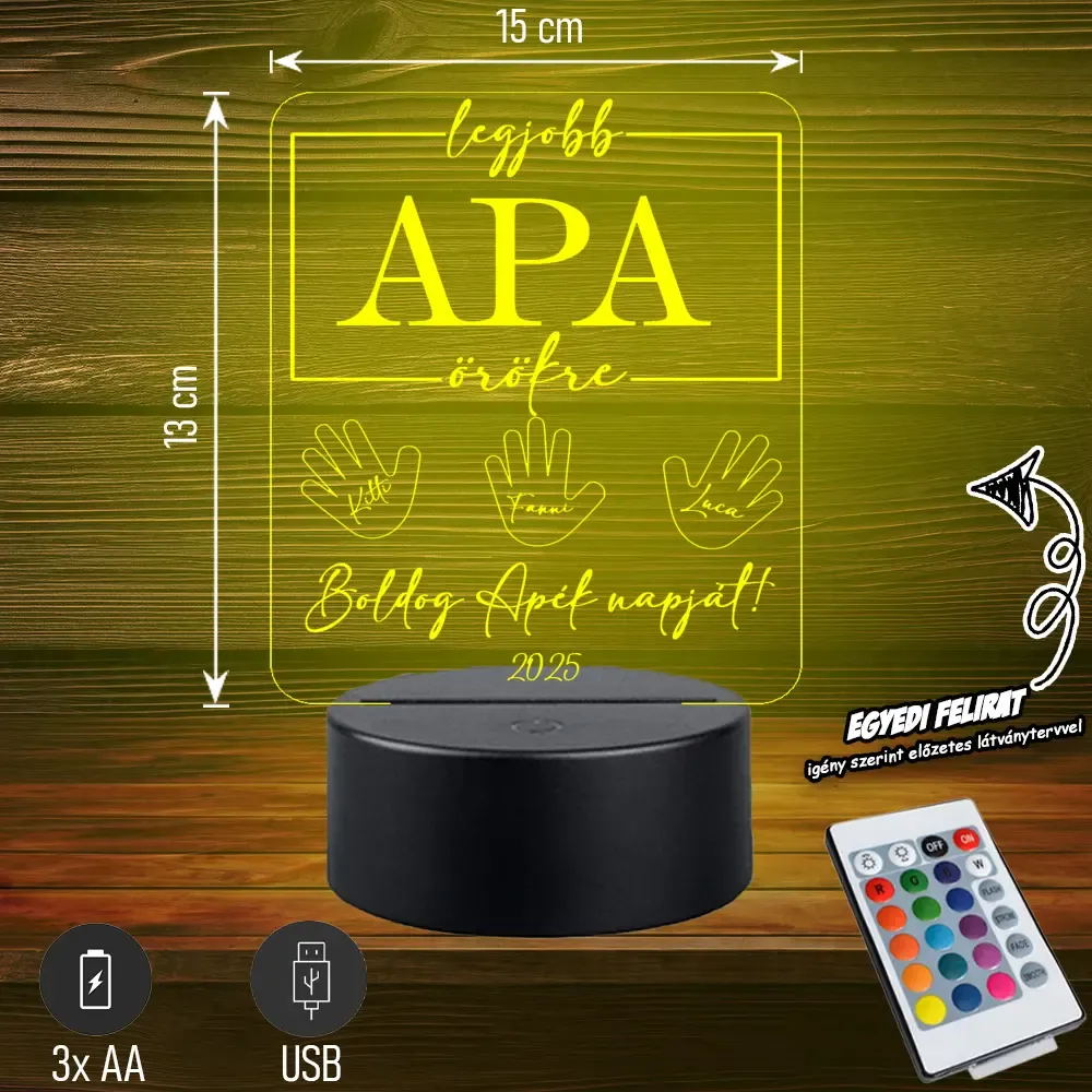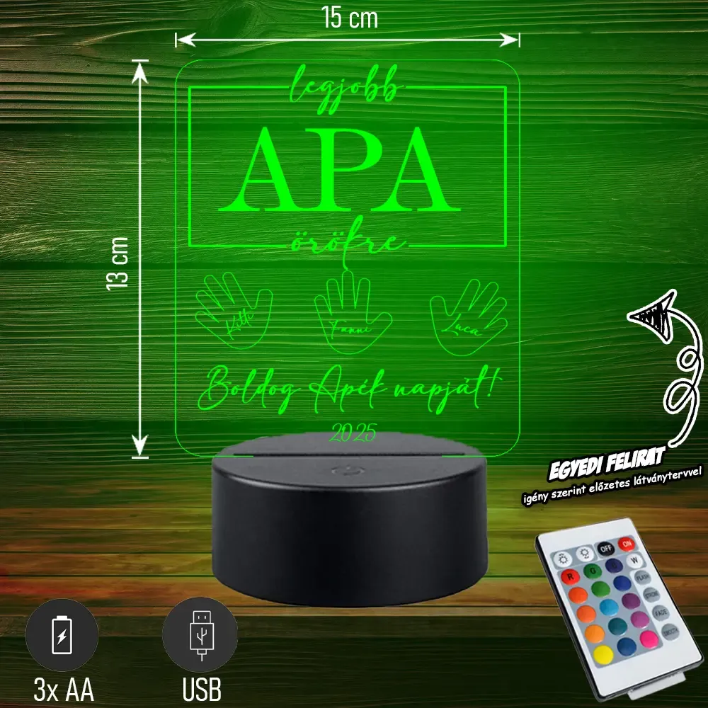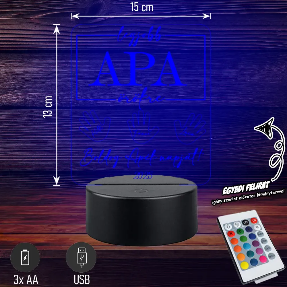 ✨ Legjobb Apa Örökre | 3D LED Lámpa – Egy különleges, személyre szóló ajándék, amivel kifejezheted, mennyire fontos számodra apukád. Modern, hangulatos fényforrás és örök emlék egyben. 🎁💡 Bővebben| Cikkszám | GM3DAA09 |